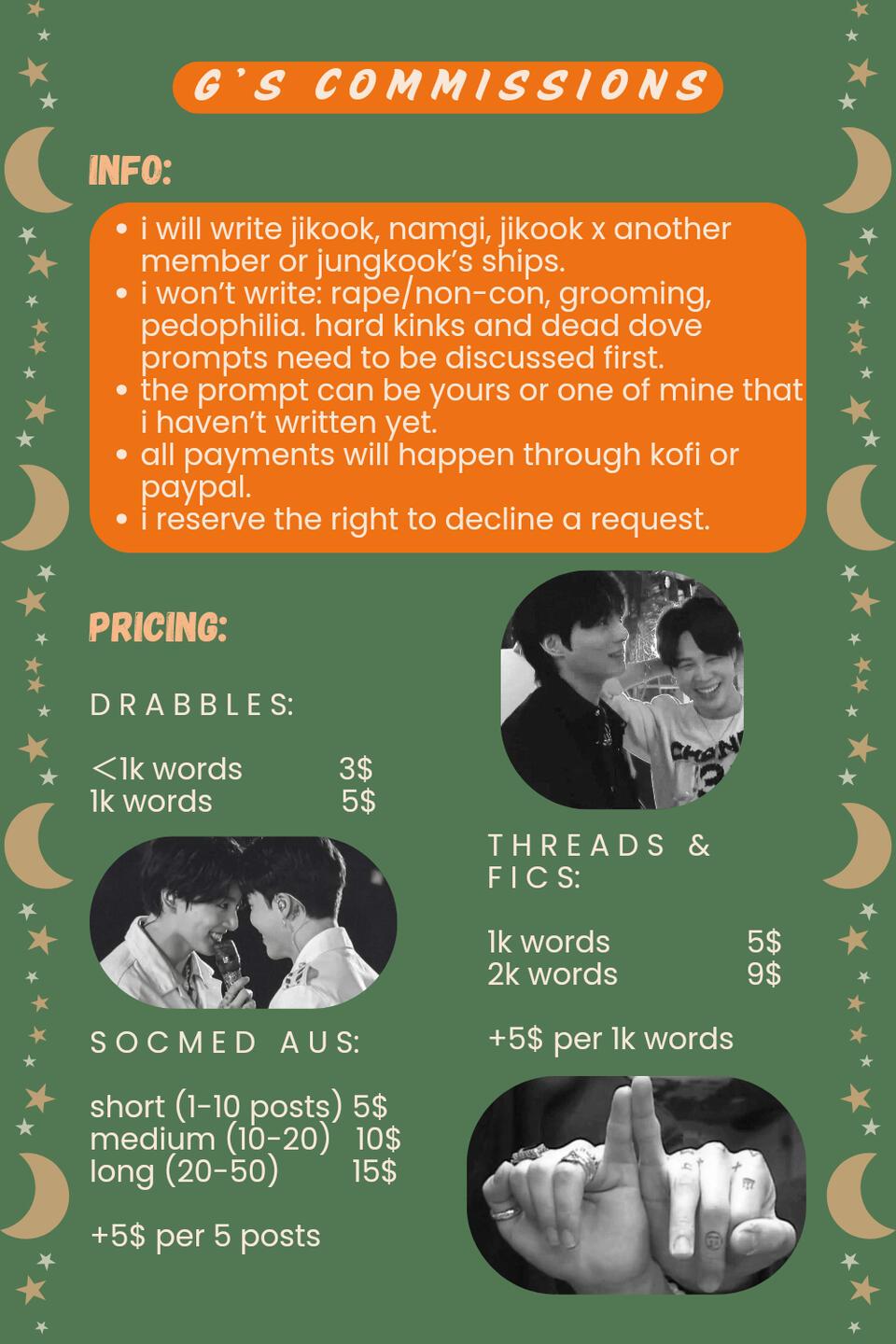 i'm a n/sfw writer and i mainly write jikook, but i'm open to namgi, poly or jungkook's ships.a few things: